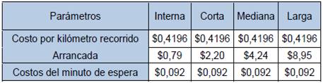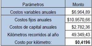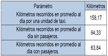 El costo por kilómetro recorrido implica el valor monetario de cada kilómetro que recorre la unidad de taxi, independiente de que esta se encuentre con o sin pasajeros, y considerando los costos operacionales, ya calculados (Ecuación 4).