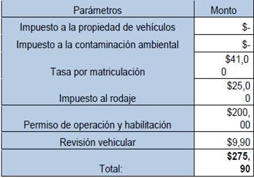 La metodología contempla los valores por el impuesto a la propiedad de vehículos y el impuesto a la contaminación ambiental, cuando la Ley del Impuesto a los Vehículos Motorizados en su artículo 6, literal c, y la Ley de Fomento Ambiental y Optimización de los Ingresos del Estado, en su artículo innumerado, numerales 2 y 3, respectivamente, señalan que los taxis para su operación estarían exentos del pago de estos impuestos.