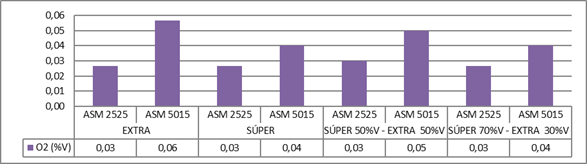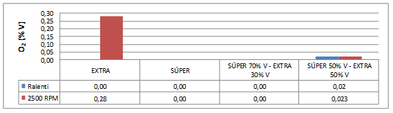 Para el caso del O2, la gasolina Súper, Extra y mezcla Súper 70%V con Extra 30%V emitieron 0.00%V en ralentí, mientras que la mezcla Súper 50%V con Extra 50% fue la más contaminante con 0.02%V. A 2500 rpm, la menos contaminantes fueron la gasolina Súper y la mezcla Súper 70%V con Extra 30%V con 0.00%V, mientras que la más contaminante la Extra con 0.28%V.
