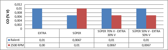 En el caso del CO, la gasolina Súper fue la menos contaminante con 0.0067%V, mientras que las demás muestras tuvieron un valor 0.01%V en ralentí, 2500 rpm la menos contaminante fue la Extra con 0%V, y la más contaminante la Súper con 0.01%V.