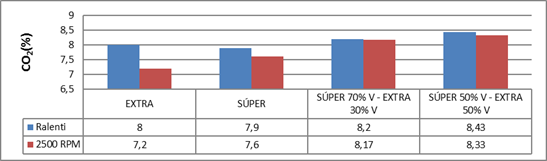 Para el CO2, la gasolina Súper fue la menos contaminante con 7.9%V en ralentí y a 2500 rpm la gasolina extra con 7.2%V. Mientras que la más contaminante fue tanto ralentí como a 2500 rpm, la mezcla Súper 50%V Extra 50%V con 8.43%V y 8.33%V respectivamente.
