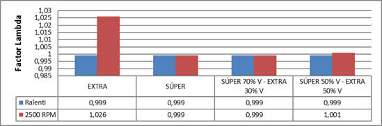 Al igual que en las pruebas dinámicas, el factor lambda no presenta mayores variaciones en las mezclas con valores cercanos a 1.0, a excepción de la gasolina Extra a 2500 rpm, con un valor de 1.026.