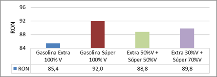 Al mezclar las gasolinas Súper y Extra, se forman un nuevo número de RON, que depende del porcentaje de volumen utilizado para cada mezcla, en ambos casos menor que la gasolina Súper. El comportamiento de los resultados obtenidos es similar a los estudios de mezcla de gasolina con alcohol anhídrido y del estudio de gasolina con adición de aditivos.