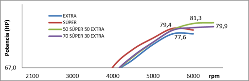 El motor con la mezcla de gasolina Súper 50%V con Extra 50%V alcanzó un valor mayor de potencia 81.3 HP, con la mezcla Súper 70%V con Extra 30%V 79.9 HP, mientras que utilizando las gasolinas que se comercializan alcanzó una potencia de 79.4 HP con Súper y 77.6 HP con Extra.