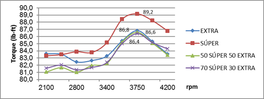 El torque usando la gasolina Súper produjo el mayor torque con 89.2 lb-ft mientras que la Extra produjo 86.8 lb-ft. Al realizar la mezcla entre gasolinas, se consiguió que el motor desarrolle menor torque.