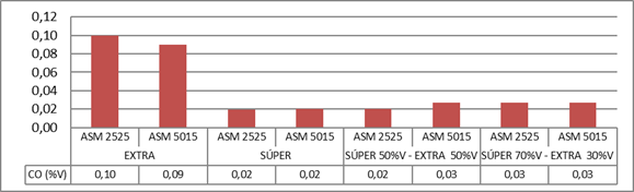 Para el CO, en el ciclo ASM 2525, la gasolina Súper y la mezcla Súper 50%V con Extra 50% V con 0.02%V mientras que la más contaminante fue la Extra con 0.1%V; en ciclo ASM 5015 la gasolina Súper fue la menos contaminante con 0.02%V y la más contaminante la Extra 0.09 %V.