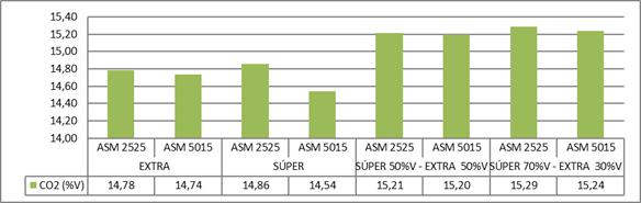 Para el CO2, en el ciclo ASM 2525, la menor medición fue para la gasolina Extra 14,78%V mientras que la mezcla Súper 70%V con Extra 30%V obtuvo el mayor valor con 15.29%V; en ciclo ASM 5015, la que menos contamina fue la Súper con 14.54 %V y la más contaminante fue la mezcla Súper 70%V con Extra 30%V con 15.24%V.