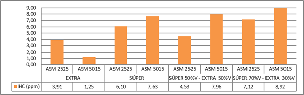 En el caso de HC, la gasolina Extra es menos contaminante con un valor de 3.91 ppm y 1.25 ppm, mientras que la Súper presenta 6.1 y 7.63 ppm para cada ciclo ASM 2525 y ASM 5015 respectivamente. Al realizar las mezclas se aumentó el valor de HC.