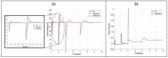 Below, there are the graphs corresponding to the simulation of the PI and SMC-IMC controller applied to the Buck-Boost converter. Table 2 shows the performance indicators to analyze the operation of the controllers.