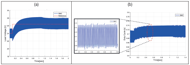 The variation of set-point is from 10 % with respect of the output as shown in the Figure 7 and Figure 8. The control action of SMC present chattering phenomenon as shown in Figure 7. Therefore, this controller is not recommendable to implement in this Buck-Boost converter.