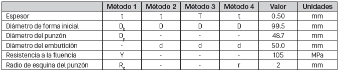 En la Tabla 3 se detalla los parámetros utilizados para el cálculo de la fuerza de sujeción para el proceso de embutido.