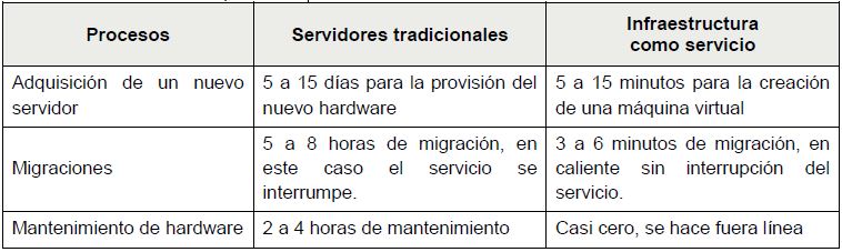 Los usuarios pueden desplegar máquinas virtuales en la infraestructura física de la IaaS en tiempos muy cortos, en los casos críticos en pocos minutos, por lo que se reduce significativamente el tiempo y coste asociado de puesta en marcha de nuevos sistemas. Además, la capacidad de ampliación de los recursos de hardware es bastante menos costosa y rápida que en el tradicional, por lo que se puede incrementar la capacidad de almacenamiento en solo minutos, dependiendo de la necesidad solicitada por el cliente (Orsi, 2010).