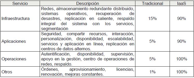 Con las características de servicios que se describen en la Tabla 2, se concluye que la tecnología de Infraestructura como Servicio supera en efectividad a los servidores tradicionales, en cuanto y tanto al cumplimiento de capacidades de integración en servicio de infraestructura y de aplicaciones, porque se ajusta a soluciones estables, con la ventaja de que permite redundancia y replicación en centros de datos alternos, no solo de los servicios y las bases de datos, sino también del sistema operativo completo, además, el fácil aprovisionamiento de almacenamiento hace que los servicios de operación sean factibles.