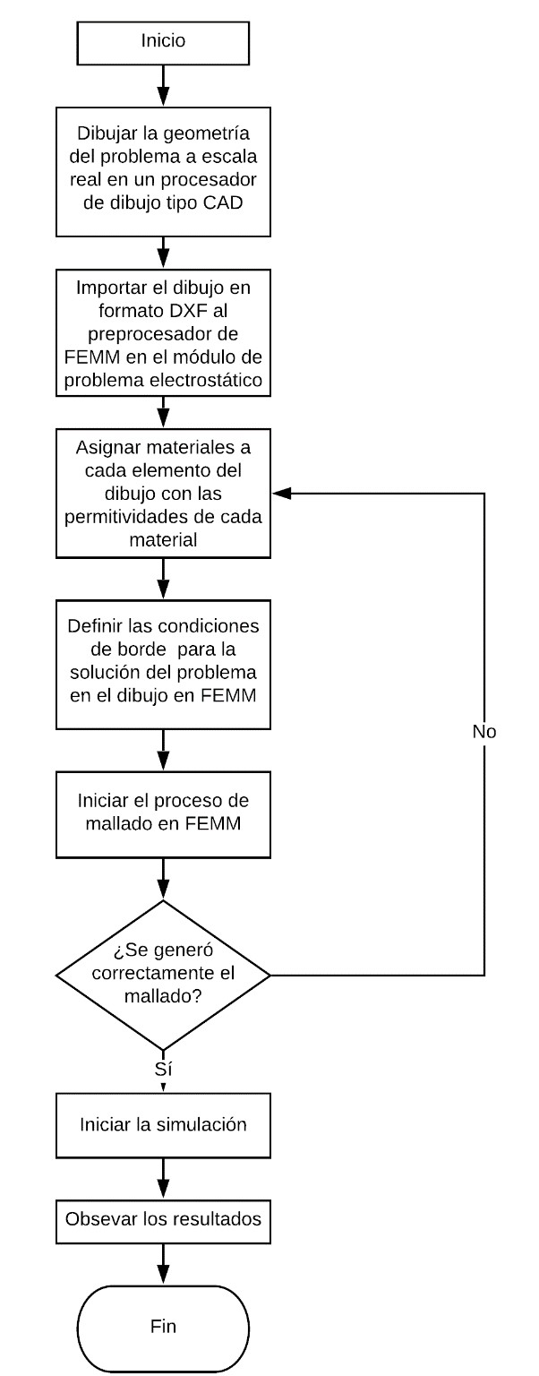 En la Figura 4 se presenta un diagrama de flujo del proceso de simulación que se sigue para obtener las distribuciones de voltaje en este artículo. Para la simulación de esta torre en FEMM, se realiza en primer lugar un dibujo a escala real en un editor de dibujo tipo CAD, que luego se importa al preprocesador de FEMM. Una vez en FEMM se deben atribuir los parámetros de los materiales a utilizar; estos valores están dados en la tabla 1 (Ordal et al., 1982).