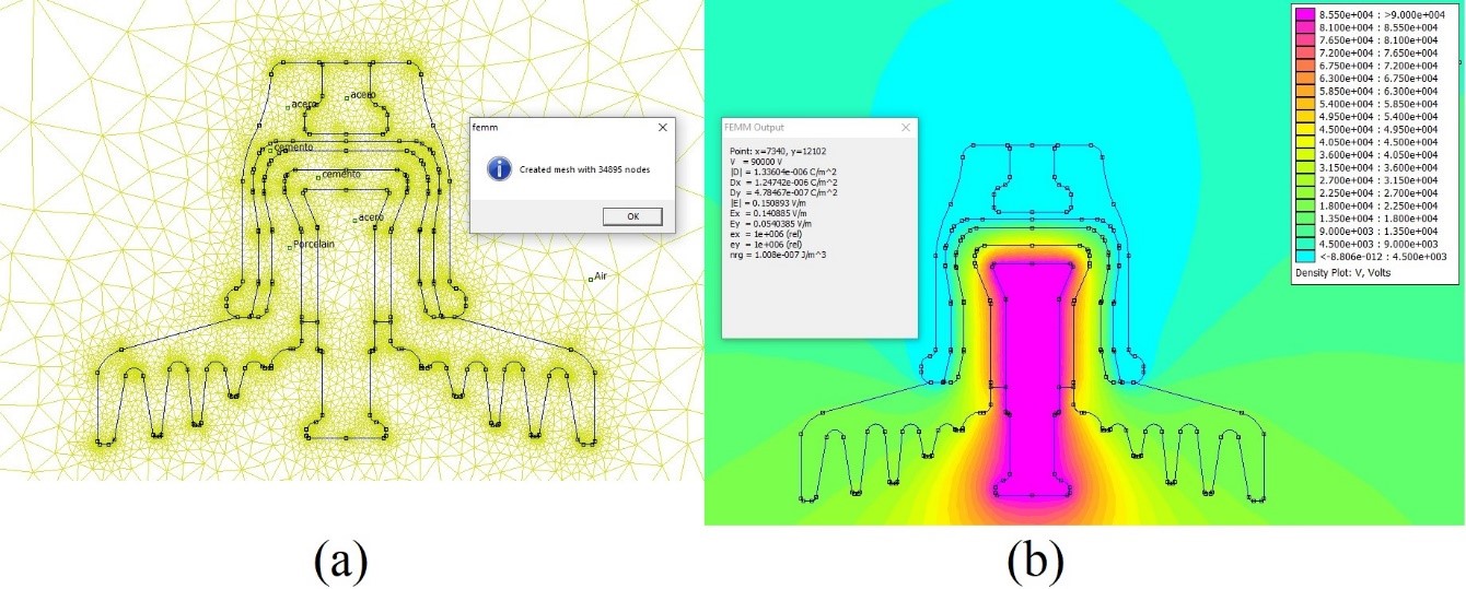 En primer lugar, se creó un aislador que se presenta en el preprocesador de FEMM en la figura 5a. Para probar el modelo del aislador se realiza la simulación a 90 kV, que es el máximo voltaje de frecuencia industrial especificado por la norma para el aislador de la figura 3. La simulación resultante se aprecia en la figura 5b.