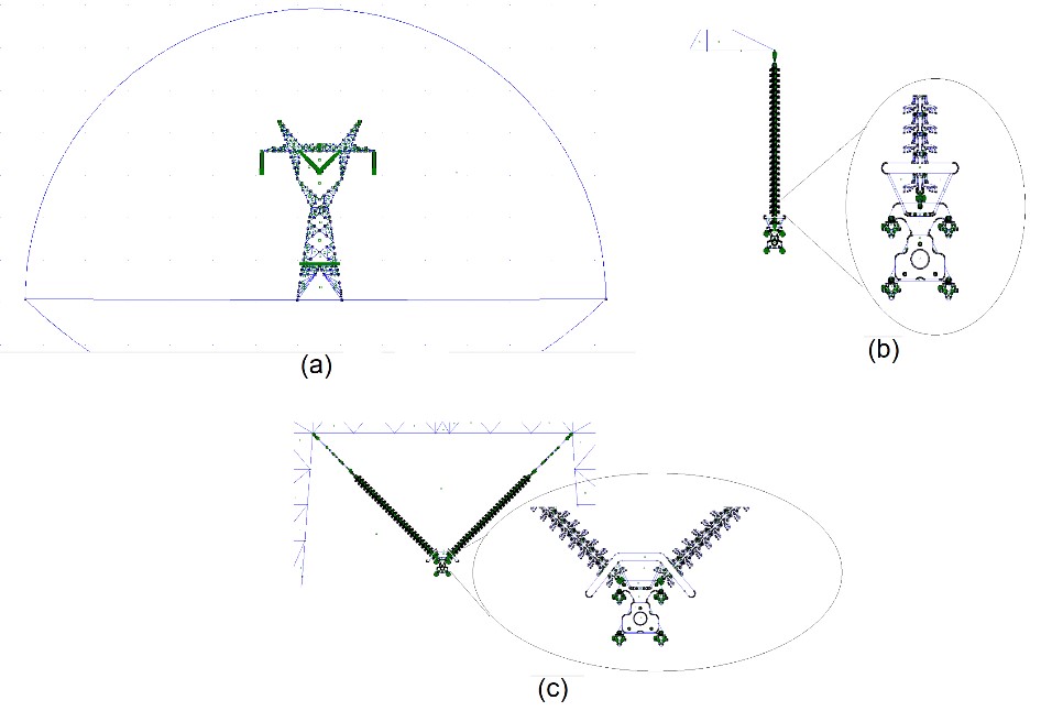 Una vez puesto a prueba el modelo del aislador se procede con el modelo completo de la línea con todos sus herrajes y aisladores. En las figuras 6a, 6b y 6c, se presentan los modelos en el preprocesador de FEMM.