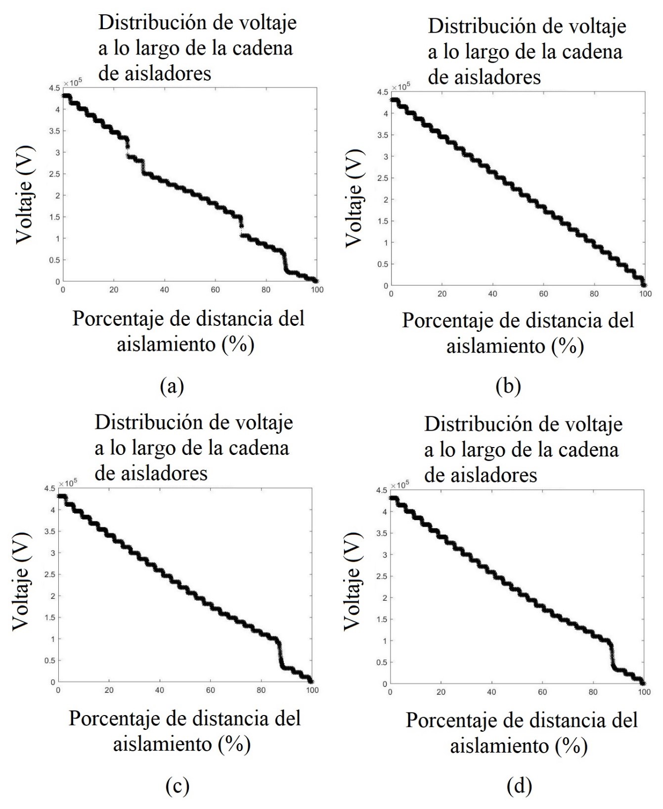 Las figuras 8a, 8b, 8c y 8d presentan la distribución de voltaje a lo largo de la cadena de aisladores de la tabla 2. La longitud de la cadena está expresada en porcentaje, siendo el nivel 0 % medido desde el aislador 1, que es el que sostiene a los conductores energizados; así, el 100 % sería la longitud de la cadena hasta la cruceta de la torre de transmisión.