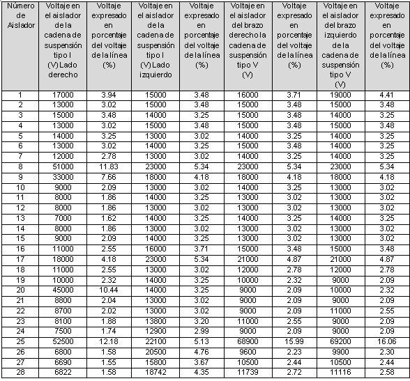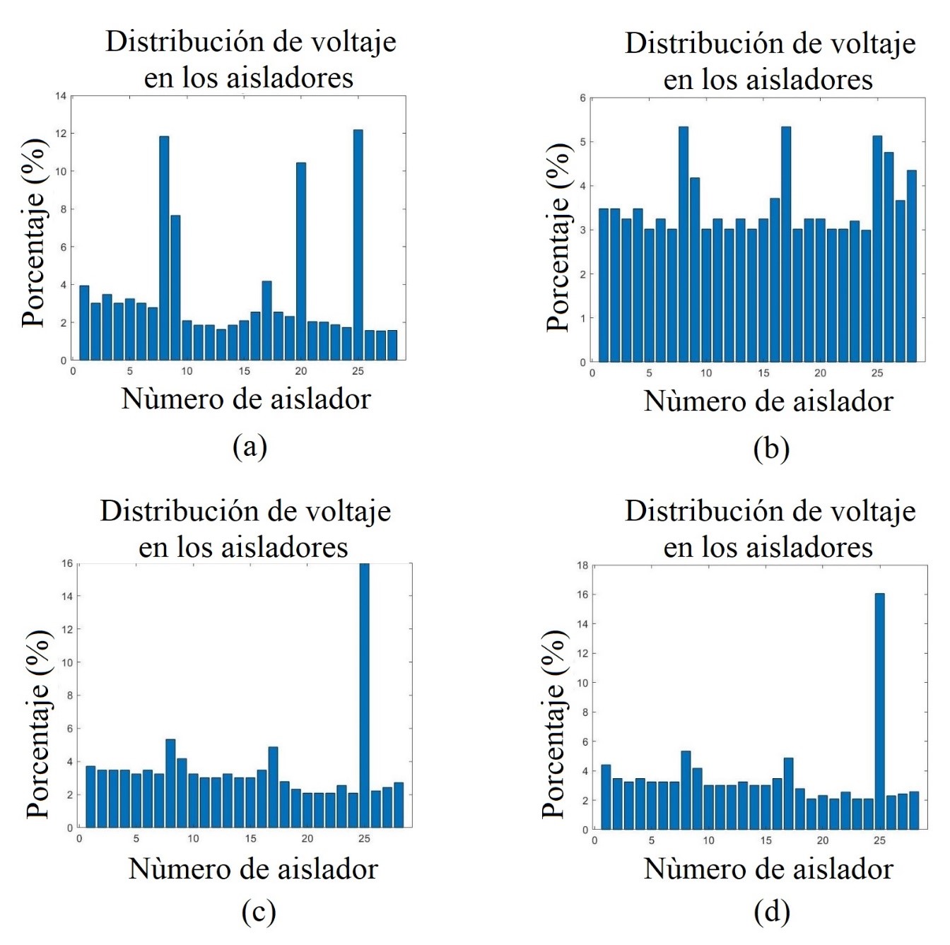 Se observa que las distribuciones de voltaje en los aisladores no son uniformes, esto puede deberse a la geometría y los materiales utilizados en la simulación, lo cual afectaría a la distribución del campo eléctrico en el espacio en estudio. En general, se puede apreciar que la mayoría de los aisladores de la cadena soportan menos del 4 % (aproximadamente 17 kV) del voltaje total de la cadena y por ello no corren ningún riesgo dieléctrico, pues están soportando un voltaje mucho menor a su nivel de aislamiento, que es de 90 kV; pero algunos aisladores pueden soportar mucho más voltaje hasta llegar a un máximo del 16.06 % (aproximadamente 69.2 kV), en el aislador 25 de una de las cadenas de aisladores. Este voltaje es mayor al nivel de aislamiento en mojado del aislador, que es de 55 kV, por lo que en condiciones de lluvia podría presentarse una falla de aislamiento en ese aislador.