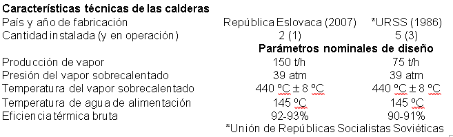 Las calderas deben operar con el combustible petróleo crudo cubano 1400, con las siguientes especificaciones técnica de calidad: viscosidad a 50 ºC (859-1484 cSt), viscosidad a 80 ºC (133-213 cSt), peso específico a 15.5 °C (0,9881-0.9994 kg/dm.), punto de inflamación en el recipiente abierto (40 ºC), carbón conradson (10.55-13.34 %), ceniza (0.044-0.076%), agua (1.6-2.0%), azufre (6.33-8.0%), vanadio (64-86 ppm), níquel (30-48 ppm), sales (310-462 ppm), asfaltenos (17.3-19.75%), hidrógeno (9.64-10.27%), carbono (79.70- 80.95%) y potencia calorífica inferior (9200-9208 kcal/kg). Además, la temperatura de bombeo tiene que estar en el rango de 50 a 75 °C.