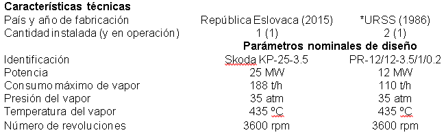 Está equipada con tres turbinas a condensación con extracciones reguladas para el proceso (a 10.5 y 2.0 bar), así como una extracción no regulada para el calentamiento del agua de alimentación a las calderas. Sus características se exponen a continuación.