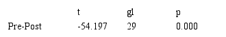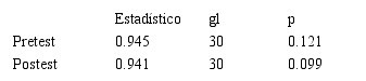 En la Tabla 1, se observa la normalidad del test, para ello se utilizó la prueba de normalidad Shapiro-Wilk, debido a que la muestra fue un total de 30 individuos. Se concluyó que los datos siguen una distribución normal, dado a que el valor de p es mayor a 0.05.