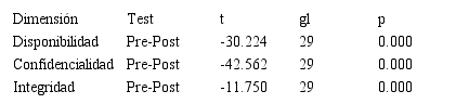 En función de los resultados de la prueba estadística t de Student, mostrada en la Tabla 2, se concluye que el estudio ha logrado mejorar la gestión de seguridad de la información, basándose en los tres pilares fundamentales que son i) confidencialidad, que busca garantizar que la información no sea divulgada a personas o sistemas no autorizados; ii) integridad, mantener inalterable la información ante accidentes o intentos maliciosos; y iii) disponibilidad, brindar accesibilidad a la información en el momento y en la forma en que los usuarios autorizados lo requieran.