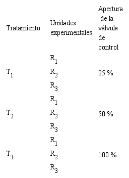 Se elaboró un diseño experimental completamente al azar con un solo factor (agua residual doméstica), contando con tres tratamientos y con tres repeticiones, donde se obtuvo un total de nueve unidades experimentales, las cuales son las muestras del agua residual doméstica tratada (Tabla 1). Estos tratamientos están constituidos por el caudal (l/s) que es manipulado con diferentes aperturas de la válvula de control, la que pudiera influir directamente en el tiempo de retención hidráulico medido en horas. Asimismo, se hicieron pruebas de Tukey y gráficos estadísticos mediante el software InfoStat y Microsoft Excel.