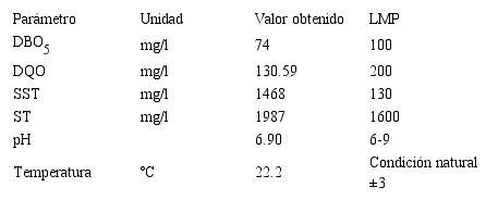 Se puede constatar que el agua residual doméstica sin tratar presentó un valor de DBO. y DQO igual a 74 y 130.59 mg/l respectivamente, es decir, se encuentra dentro del límite máximo permisible que establece la normativa ambiental vigente del Ecuador. Sin embargo, los sólidos suspendidos y sólidos totales se encontraron por encima del límite establecido, con valores de 1468 y 1987 mg/l respectivamente. Además, el pH del agua se encuentra dentro del rango 6-9 al igual que la temperatura con 22.2 °C.