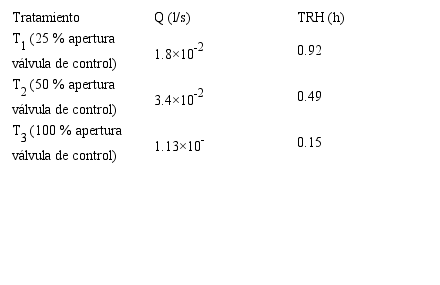 Para medir el caudal, se llevaron a cabo tres repeticiones con tres tipos de apertura de la válvula de control, a partir de la cual se obtuvo un caudal promedio por cada tratamiento para así obtener resultados más exactos del TRH, los cuales se muestran en la Tabla 3.