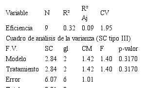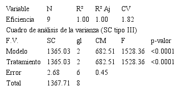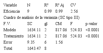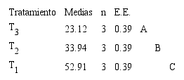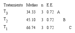 De esta manera, al realizar una comparación de medias mediante la prueba de Tukey, con un 5 % de probabilidad de error, se identificaron tres grupos significativamente diferentes, de los cuales se observa claramente a T. como el más eficiente, con una eficiencia media de 66.74 % de remoción (Tabla 6).