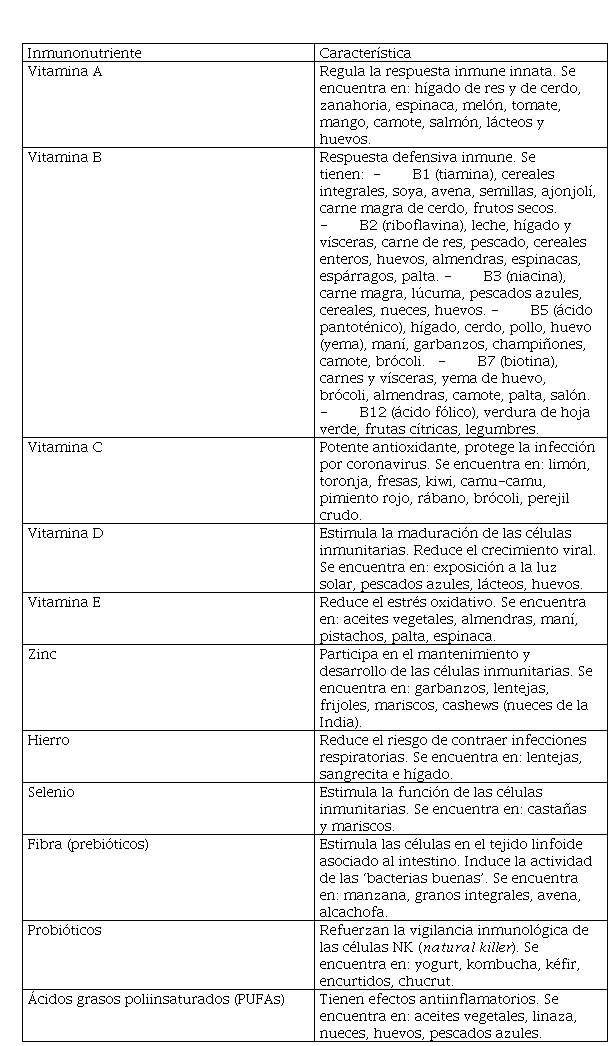 No está comprobado que el consumo de algún nutriente pueda ayudar a prevenir la infección causada por la presencia del virus COVID-19 en nuestro organismo en sujetos con sintomatología leve. Aunque algunos nutrientes como: cobre, folatos, hierro, selenio, vitamina A, vitamina B12, vitamina B6, vitamina C, vitamina D y zinc contribuyen al funcionamiento correcto del sistema inmunitario. Tal como menciona European Food Safety Authority (EFSA, 2020), no se puede concluir aún que el consumo de estos nutrientes puede detener el riesgo de padecer complicaciones sintomatológicas del nuevo virus ni mucho menos consumir estos nutrientes para este fin. Esta última conclusión ha sido revisada a detalle sobre potenciales intervenciones dietéticas en coronavirus reforzados por las conclusiones de un trabajo realizado sobre SARS, MERS y COVID-19 (Academia Española de Nutrición y Dietética, 2020).