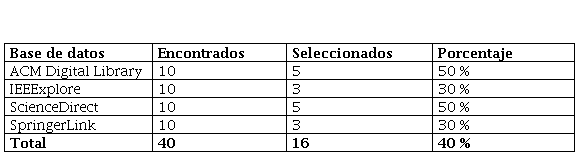 Luego de aplicados los criterios de inclusión y exclusión, de los 40 artículos, fueron seleccionados 16. En la Tabla 1 se relaciona la cantidad de artículos por cada una de las fuentes consultadas.