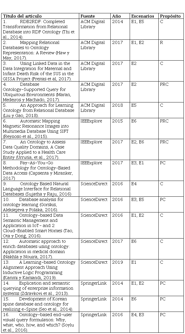Los resultados de las preguntas de la investigación se encuentran detallados en la Tabla 2, la cual constituye un inventario de los trabajos más relevantes en los últimos seis años sobre la vinculación de las bases de datos relacionales y las ontologías. En la primera columna aparece el título del artículo, le sigue la fuente en la segunda columna y el año de publicación en la tercera columna. En la cuarta columna se representan los tipos de escenarios, los cuales se han representado con los posibles valores: mapeo de bases de datos relacionales a ontologías y viceversa (E1), ontologías para la integración de fuentes de datos heterogéneas (E2), acceso a datos basado en ontologías (OBDA) (E3), consultas en lenguaje natural basado en ontologías (E4), aprendizaje ontológico a partir de bases de datos relacionales (E5) y aporte semántico mediante ontologías (E6). Los tipos de escenarios surgieron de la lectura de los artículos, lo cual según Petersen et al. (2015) ocurre comúnmente en este tipo de investigaciones. En este caso, un artículo puede abordar más de un escenario. En la quinta columna se representa el propósito del trabajo que puede tomar uno de los valores establecidos por Tonella et al. (2007): propuesta conceptual (PC), prueba de concepto (PRC), cuantificación (C), comparación (CO), comparación condicional (CC) y revisión (R).
