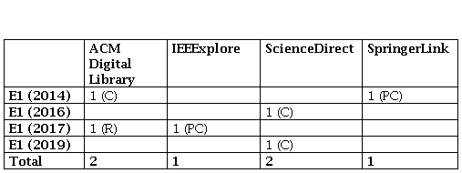 La búsqueda de los estudios primarios se realizó en las siguientes bases de datos bibliográficas: IEEExplore, ACM Digital Library, SpringerLink y ScienceDirect. En cada una de ellas se aplicó la cadena de búsqueda: (ontology AND database) OR (ontologies AND database). Se realizaron las búsquedas sobre el campo ‘resumen’ y se seleccionaron los 10 artículos más relevantes en los últimos seis años de cada una de las fuentes para un total de 40 documentos.