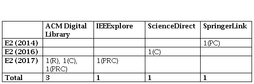 En la revisión del presente trabajo se pudo constatar que el 38 % de los artículos analizados abordan el mapeo de bases de datos relacionales a ontologías y viceversa. En ese grupo de artículos clasificados por el tipo de propósito se tienen: tres cuantificaciones (C), dos propuestas conceptuales (PC) y una revisión (R). Clasificados por el tipo de fuente en que fueron publicados se tienen: dos en ACM Digital Library, uno en IEEExplore, dos en ScienceDirect y uno en SpringerLink (ver Tabla 3).