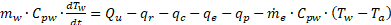 [Ec.1]El agua del depósito principal(mw) recibe la energía proveniente del colector solar (Qu), libera energía hacia el medio ambiente a través de las pérdidas de calor (qp) y la salida del destilado (m0). Adicionalmente, intercambia calor con el fondo del primer depósito mediante radiación (qr), convección (qc) y evaporación (qe).