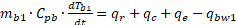[Ec.2]El fondo del primer depósito (mb1) recibe energía del agua del depósito principal mediante radiación (qr), convección (qc) y evaporación (qe), y transfiere calor por convección (qbw1) al agua del primer depósito.