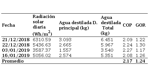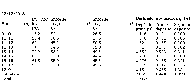 En la Tabla 1 se indican las temperaturas promedio del agua y la masa del destilado producido en cada compartimiento para un día de medición con una radiación solar de 5 436.63 Wh/m./día. Como era de esperarse, las mayores temperaturas se alcanzan en el depósito principal (máxima de 74 °C entre las 12:00 y 13:00) y las más bajas en el segundo depósito, obteniéndose valores intermedios en el primero. Algo similar ocurre con la producción de agua destilada, en la que de un total de 5.967 kg, 2.665 kg (44.7 %) son generados en el depósito principal, 1.994 kg (32.6 %) en el primer depósito y 1.358 kg (22.8 %) en el segundo depósito. Este comportamiento es típico del funcionamiento de una torre de destilación con múltiples etapas en la que la recuperación de calor va disminuyendo en las subsiguientes etapas o depósitos. Estos porcentajes se mantuvieron relativamente constantes durante todas las pruebas del prototipo, a excepción de ciertas condiciones de operación en las que la producción de agua fue muy baja o los niveles de radiación solar fueron muy irregulares en el transcurso del día. En términos generales, en el depósito principal y primer depósito se genera la mayor parte del destilado en la mañana y en la tarde. Mientras que en el segundo depósito casi la totalidad del destilado se produce en la noche y en la madrugada.