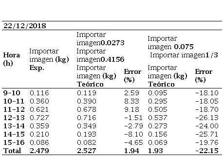 La evaluación de C2y n2 no fue posible, ya que la generación de agua en el segundo depósito se presentaba principalmente en la noche, periodo en el cual no se podía recolectar información. En la Tabla 2 se comparan los datos experimentales de agua producida en el depósito principal con los valores calculados a partir de las constantes obtenidas experimentalmente y de las propuestas por Dunkle. Existe una buena aproximación entre los datos reales y los calculados a partir de las constantes evaluadas experimentalmente, con un error máximo del 9.18 % en el depósito principal y del 4.81 % en el primer depósito. Por el contrario, cuando se emplearon las constantes propuestas por Dunkle (C = 0.075 y n = 1/3) el error fue mucho mayor, subestimándose hasta en un 26.13% la masa de destilado y producido.
