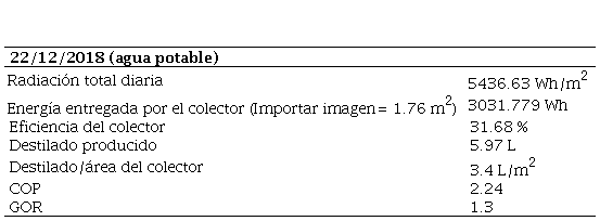 El valor de Qu es igual a 3031.779 Wh, con una eficiencia del colector del 31.68 %. Pese a que los niveles de radiación solar son elevados, la eficiencia del colector es relativamente baja. Condición que puede atribuirse en parte a la mencionada restricción de flujo, así como a las altas temperaturas y ausencia de estratificación térmica en el agua del depósito principal (muy pequeña altura de líquido). Una forma de compensar este problema consistiría en aumentar la distancia vertical entre el colector solar y la torre de destilación, modificación que incrementaría el flujo de agua y, por ende, también la eficiencia del colector.