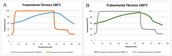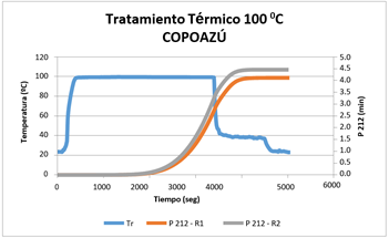 Seguidamente, se sometió la pulpa a tratamiento térmico de 100 °C para determinar el tiempo de proceso. Se colocaron sensores en la pulpa de copoazú envasada para controlar el punto más frío, la temperatura del producto y el tiempo en el que se acumula la letalidad deseada. Según estos resultados, se trató térmicamente el producto (muestra por duplicado) procesando los datos a través del método general por la técnica de rectángulos y los métodos de la fórmula de Stumbo (1973), y así se pudo verificar el cumplimiento de los parámetros obtenidos en el diseño.