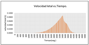 La UP, a partir del método de Stumbo para el proceso de tratamiento R1, arrojó como valor 4.02 ± 0.34 min. El mismo método se aplicó para determinar el tiempo de procesamiento para temperatura a 100 °C, que resultó 28.35 ± 0.34 min. En cambio, por el método general, la suma de la letalidad conseguida en el tiempo de proceso fue de 46.60 min con los que se alcanzó 4.10 min de UP. La figura 4 muestra la acumulación de la velocidad letal (área bajo la curva) en cada intervalo de tiempo evaluado (20 segundos).