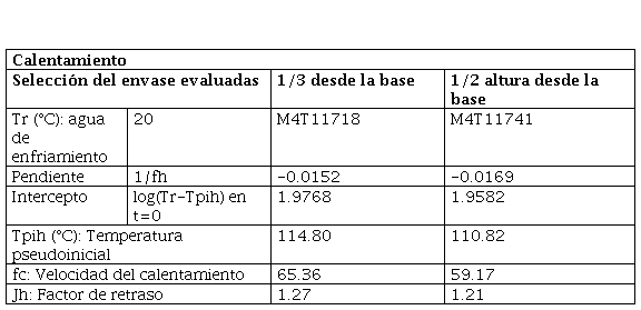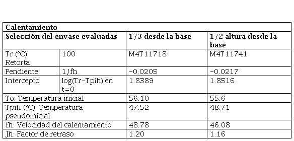 Los parámetros de penetración de calor para el calentamiento y enfriamiento del enlatado de la pulpa de copoazú se muestran en la tabla 4. Se observa que los valores de fh y fc presentan una diferencia de 16.58 min con un 25.37 % respecto al valor fh. Esta diferencia indicaría que la transferencia de calor es una combinación de convección y conducción pura. Según Sharma et al. (2003), en los productos que se calientan por convección, el punto más frío se sitúa sobre el eje vertical ligeramente más abajo del centro geométrico. Por esta razón, se confirma que el calentamiento de la pulpa de copoazú se realizó por convección lenta. Se calculó el valor Po objetivo en función del moho Byssochlamys fulva mediante la siguiente fórmula: