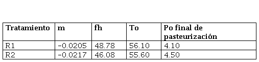 El análisis de los gráficos permitió obtener información de los valores de Po al final de la pasteurización (tabla 3). Se observa que el tratamiento (R1) presenta un menor valor Po, correspondiente al segundo tratamiento (R2). Además, este tratamiento (R1) presenta el mayor valor fh (47.78), que permite confirmar como punto de calentamiento más lento.