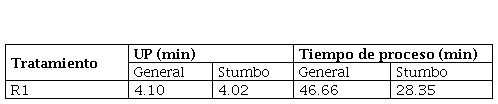 Los resultados obtenidos de la UP por ambos métodos (tabla 5) fueron corroborados con los cálculos establecidos del valor UP objetivo (5 min). Se puede ver que en el tratamiento R1 el valor obtenido por el método general fue el más cercano (4.10 min).