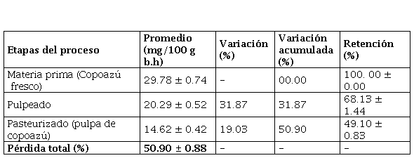 Según los resultados, el ácido ascórbico (b.h) del copoazú fresco (29.78 ± 0.74 mg/100 g) disminuyó progresivamente durante el pulpeado (20.29 ± 0.52 mg/100) y la pasteurización 14.62 ± 0.42 mg/100 g, por lo que la pérdida total es de 50.90 ± 0.88 mg/100 g, con una retención total de 49.10 % ± 0.83.