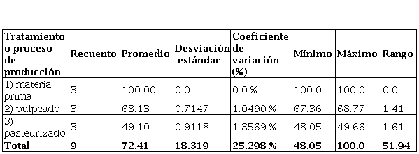 Se evaluó el efecto del procesamiento de la pulpa de copoazú enlatada en la variación de la vitamina C por triplicado. Los resultados fueron expresados como la media de tres dimensiones ± error estándar, estos se compararon entre sí y con respecto a la materia prima. Para ello, se aplicó un diseño completamente al azar (DCA) en la etapa 2 y 3, se analizaron las diferencias estadísticas entre las medias, considerando 95 % (p < 0.05) de intervalo de confianza. Se empleó un factor categórico (proceso de producción de la pulpa enlatada en copoazú) con tres niveles referentes a las etapas del proceso: materia prima, pulpeado y pasteurizado. Para el análisis de varianzas y pruebas de comparación de Tukey, se lo hizo a través del programa Statgraphics Centurion XV. II.