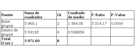 La tabla 8 de ANOVA descompone la varianza de ácido ascórbico en dos componentes: uno entre grupos y uno dentro de grupos. El F-Ratio, que en este caso es 3 314.17 igual, es el cociente entre el estimado entre grupos y el estimado dentro de grupos. Asimismo, el P-Value de la prueba –F es menor que 0,05, donde existe una diferencia estadísticamente significativa entre la media de ácido ascórbico entre los niveles de proceso de producción, medidos con un nivel del 95 % de confianza.