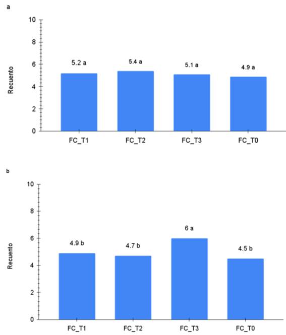 En el crecimiento de las plantas se observan diferencias significativas (p≤0.05) que forman varios subconjuntos (figura 4a). El mayor valor se registró en el T3 (106.5 cm), seguido del T2 y T3 con valores de 92.3 cm y 87.5 cm, respectivamente. Mientras que las diferencias en altura en la FO de mayor a menor de los tratamientos fue de 81.9 cm (T1), 76.3 cm (T2) y 74.5 cm (T3), mientras que el tratamiento control en la FC obtuvo el registro más bajo (72.7 cm) en todo el trabajo.