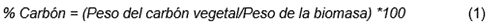 Para conocer el nivel de alcalinidad del producto obtenido, se tomó 10 g de biocarbón y se midió en agua (relación 1:2.5), y se leyó en un conductímetro (Hanna, modelo Hi5222-1, Rumania). Para determinar el porcentaje de carbón obtenido de los residuos, se dividió el peso del carbón vegetal y el peso de la biomasa seca, y se multiplicó por 100 Ec. (1) (Ekpete et al., 2017).